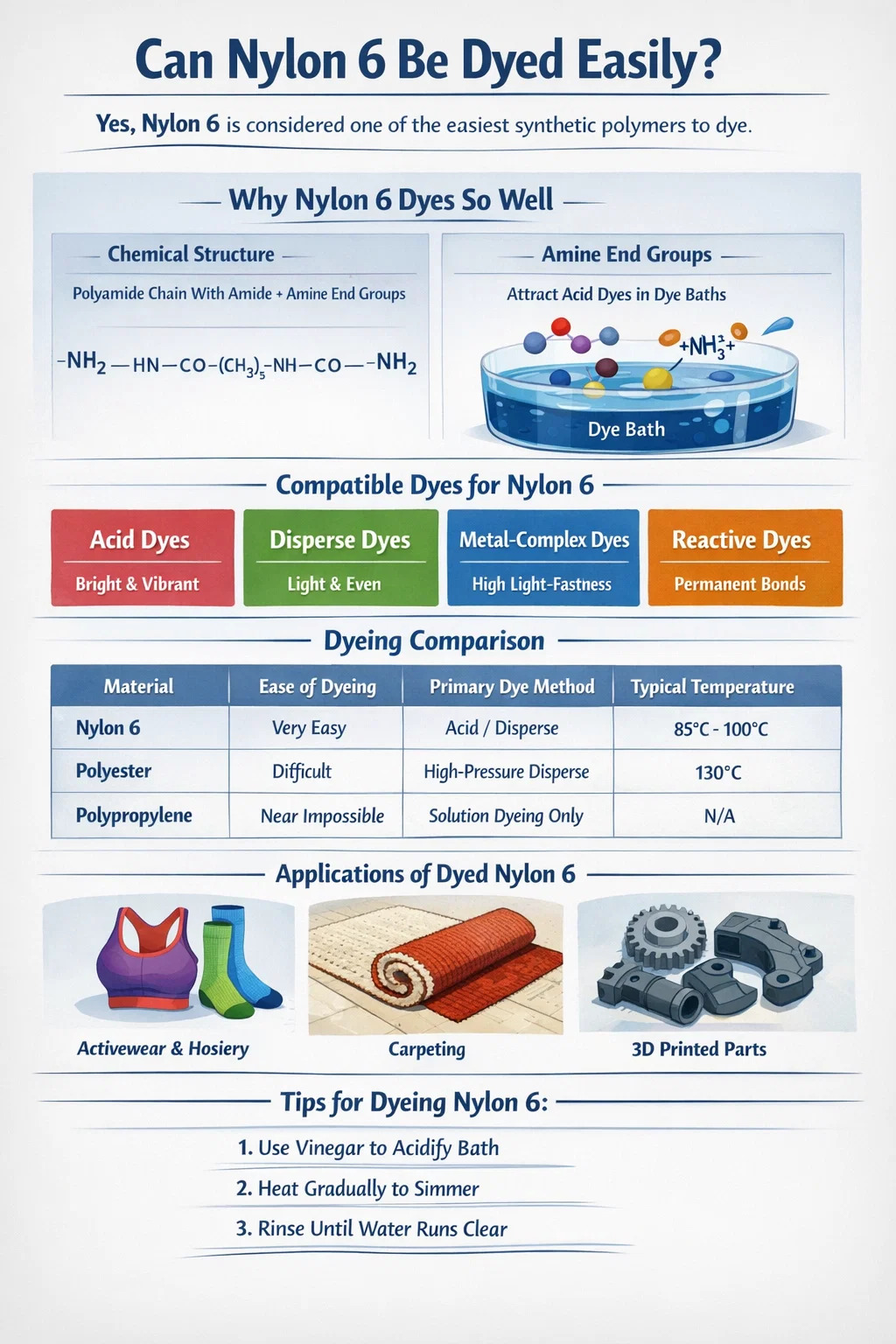 Le nylon 6 est hygroscopique, ce qui signifie qu'il absorbe l'eau. Il s’agit d’un énorme avantage en teinture, car l’eau agit comme un support, attirant le colorant profondément dans le polymère. Le nylon 6 peut absorber jusqu'à 8 à 10 % de son poids en humidité à saturation, ce qui facilite une pénétration des couleurs incroyablement profonde par rapport aux plastiques hydrophobes.
