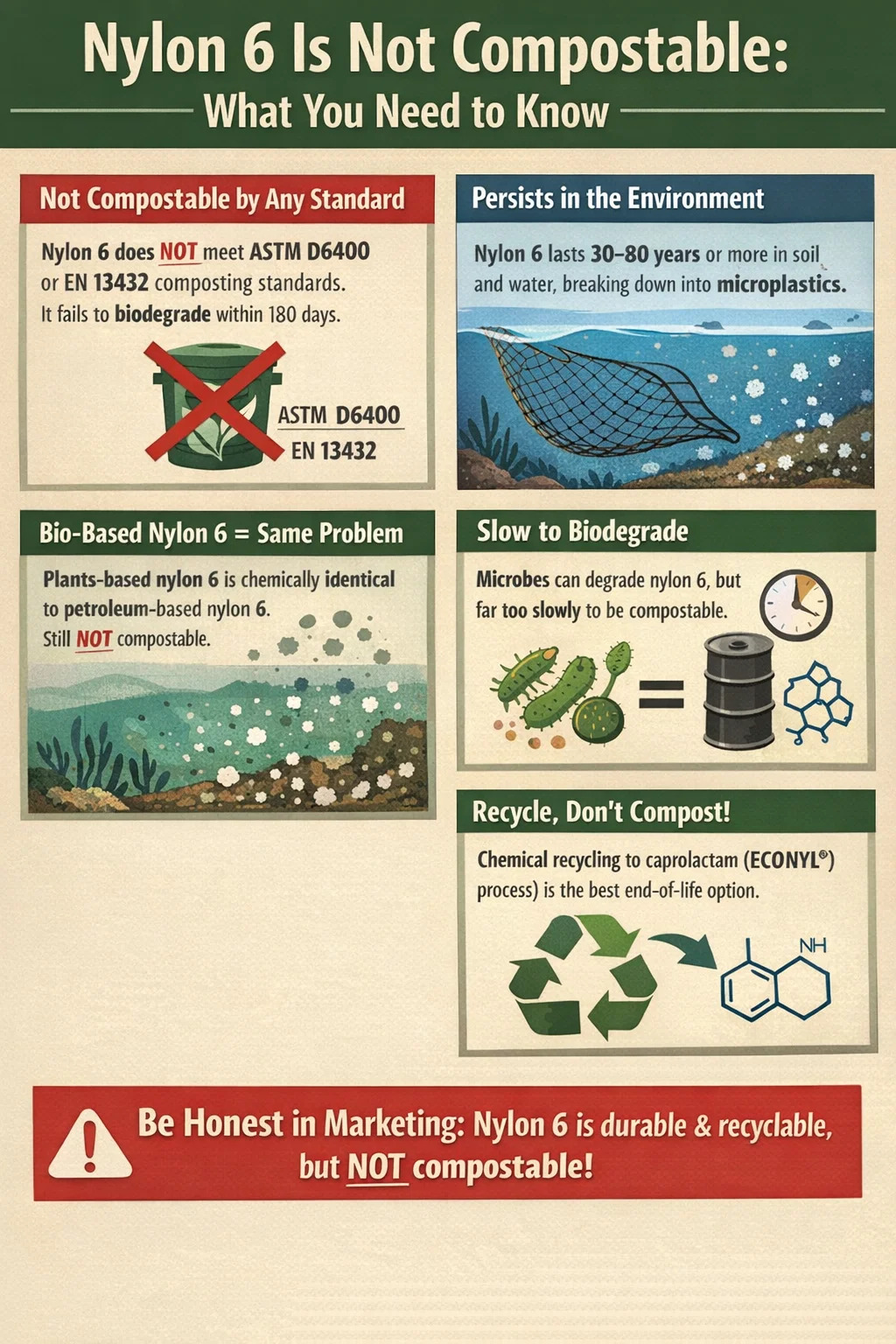 - N'étiquetez pas les produits contenant du nylon 6 comme compostables, biodégradables ou « retournant à la nature » : cela est inexact et constitue, sur de nombreux marchés, une violation de la législation sur les allégations écologiques.