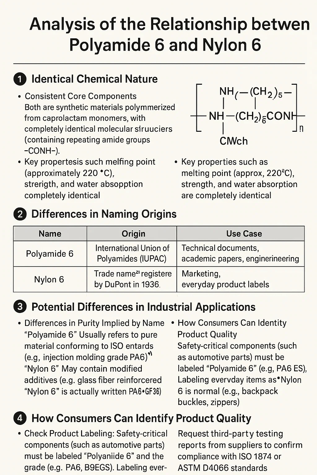 • Vérifiez l'étiquetage du produit : les composants critiques pour la sécurité (tels que les pièces automobiles) doivent être étiquetés « Polyamide 6 » et leur qualité (par exemple, PA6, B3EG5). Il est normal d'étiqueter les objets du quotidien comme « Nylon 6 » (par exemple, boucles de sac à dos, fermetures éclair).