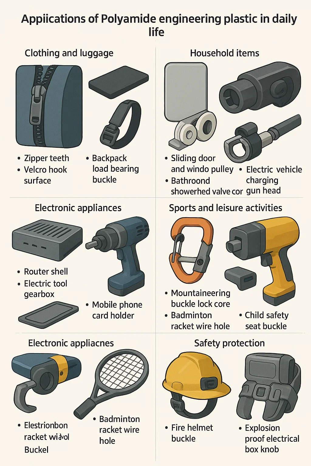 L'application de ingénierie en plastique polyamide Dans la vie quotidienne, imprègne plusieurs champs, et sa valeur fondamentale réside dans les caractéristiques du remplacement de l'acier par du plastique et d'être léger et durable. Les scénarios typiques spécifiques sont les suivants:
