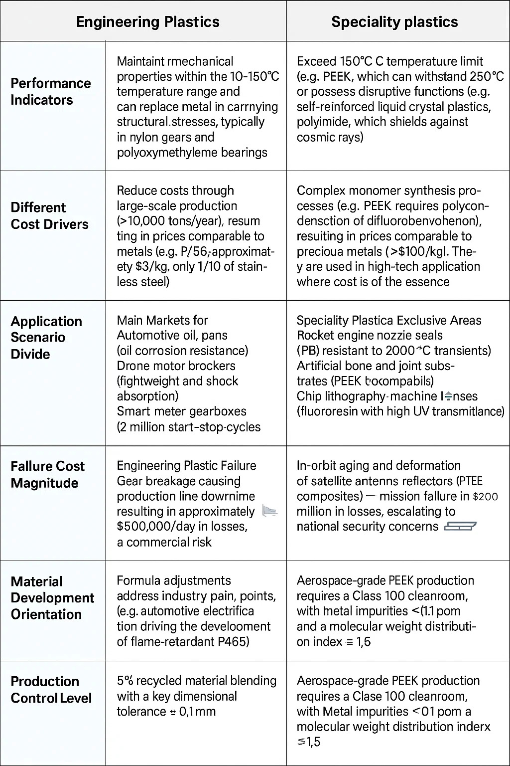 Plastiques spécialisés : dépassent la limite de température de 150°C (par exemple, le PEEK, qui peut résister à 260°C) ou possèdent des fonctions perturbatrices (par exemple, les plastiques à cristaux liquides auto-renforcés, le polyimide, qui protège contre les rayons cosmiques).